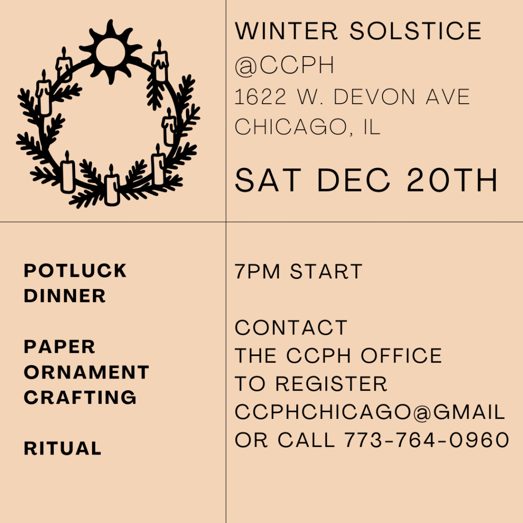 Saturday December 20th 7-9:30pm. Winter Solstice Ritual: Contact the CCPH office for more information.